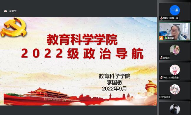 为了使新生更快了解和融入教育科学学院,提高其政治素养,教育科学学院于9月26日为新生开展线上政治导航教育。本次讲座由教育科学学院22级辅导员江敏老师主持,教育科学学院组织员李国敏老师主讲,大一全体新生参与。