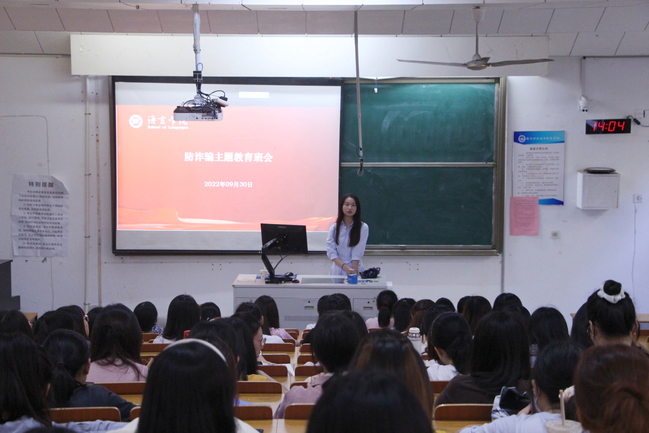 为增强学生防诈骗意识,提高自我防范能力,9月29日、30日下午,语言学院开展防诈骗主题教育班会。会议由语言学院辅导员何江岳主讲,2020级全体学生参加。