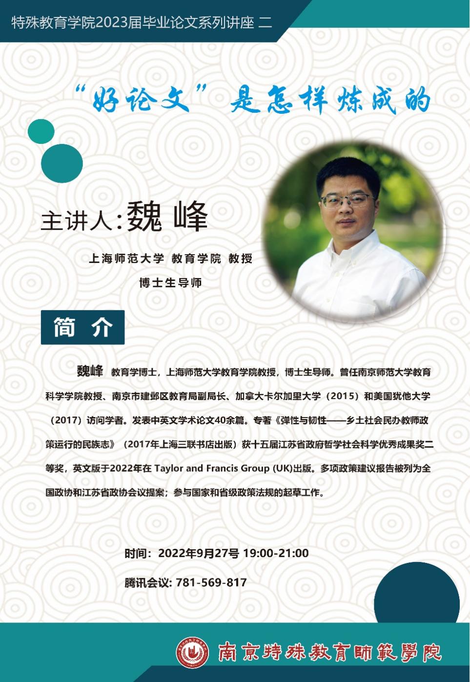 9月27日晚,特殊教育学院2023届毕业论文系列讲座继续通过腾讯会议线上举办,讲座以《“好论文”是怎样炼成的》为主题,由上海师范大学教育学院博士生导师魏峰教授主讲。特殊教育学院2023届毕业生及部分学院教师参与讲座活动,讲座由特殊教育学院院长助理慕雯雯主持。