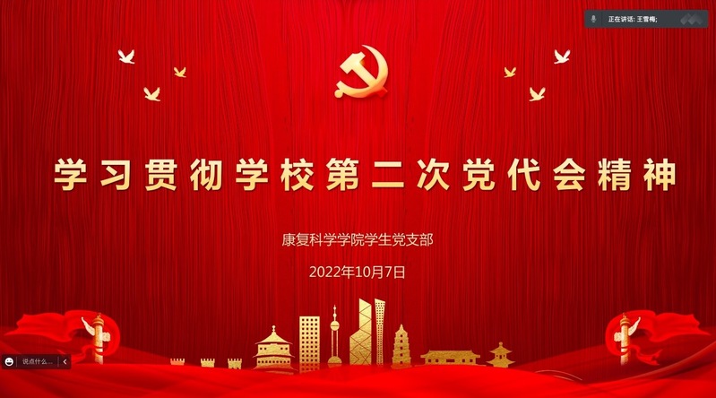 10月7日,康复科学学院学生党支部于线上集中学习学校第二次党代会精神。会议由学生支部书记王雪梅主持,支部全体党员参加会议。