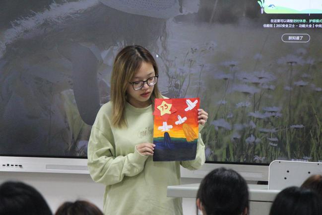 在此次活动中,参赛同学都自信地展示自己的手工作品,介绍创作理念,充分体现出同学们对这次活动的重视和独特的创造能力。基于“心相印,为祖国诞辰欢欣;爱同航,为中华繁荣祝福”的创作理念,孙文佳同学将祖国的大好河山、风筝等嵌入她的作品,充分表达了她对祖国未来更辉煌的美好祝愿。甘扬同学将五星红旗这一红色元素融入到作品中,她分别用红色、橙色、黄色、蓝色比喻革命、太阳、人民、大海,将这四种颜色作为底色进行大面积涂抹,与五星红旗紧紧环绕,象征着中国共产党带领人民在祖国这片大地上努力奋斗,创造出一个个奇迹。她坚信繁花将铺满天安门前,她借此祝愿祖国生日快乐,一路繁花相伴。