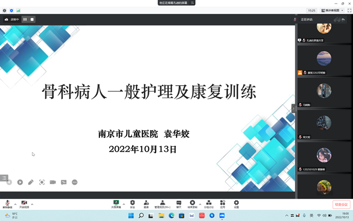 为减少和预防骨科术后并发症,帮助康复科学学院康复治疗学专业同学更好实现学以致用、知识融会贯通,2022年10月13日,康复科学学院邀请南京市儿童医院骨科医生袁华姣为大家带来了一场精彩绝伦的学术讲座——“骨科病人一般护理及康复训练”,讲座线上进行,康复治疗学专业全体师生参加,2022级辅导员孔迪老师主持。