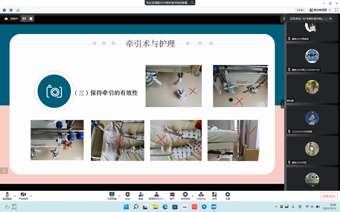 袁华姣医生从牵引术与护理、石膏绷带术与护理、骨科病人的功能训练、参考文献四个方面展开论述,借助护理图例及临床视频,用简洁精辟的学术语言,风趣幽默的表达方式向广大师生详细介绍了骨科病人术后康复训练的重要意义和工作要点,让大家直观感受到了骨科疾病给患者带来的不同程度的影响。