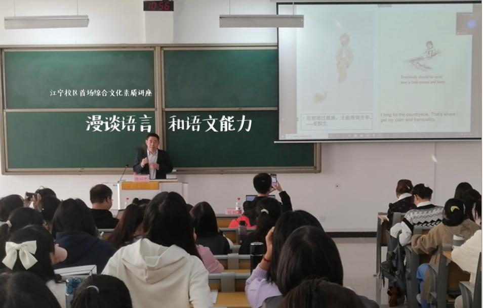 为加强大学生文化素质教育,培养创新型人才,促进我校大学生全面发展,我校江宁校区于10月15日上午举办主题为“漫谈语言和语文能力——兼论新文科背景下人才成长的路径与策略”的综合文化素质讲座。南京航空航天大学外国语学院副院长徐以中教授受邀主讲。活动由特殊教育学学院副院长张伟锋博士主持,采用主会场与分会场结合、线上线下同步直播的方式进行,江宁校区数百名2022级新生参加。
