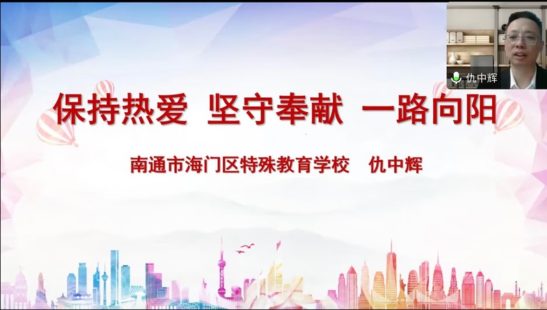 仇中辉校长参加工作以来先后获评南通市优秀教育工作者,海门市十佳青年教师,海门市优秀校长,海门区首届领航校长。海门区特殊教育学校先后取得全国教育系统先进集体、江苏省特殊教育示范学校等荣誉称号。2019年5月,海门市特殊教育指导中心获评全国助残先进集体,仇中辉校长作为获奖代表赴京在人民大会堂受到习近平总书记亲切接见,并合影留念。仇校长的主题讲座分为“学习与成长”“我与南京特师”“特殊教育的发展”“校园文化生活”等四个方面。