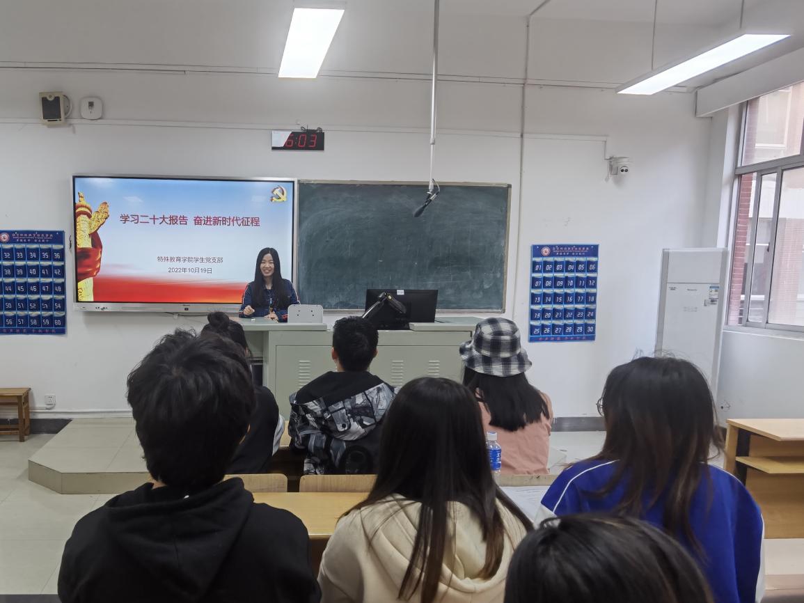 为深入学习贯彻党的二十大报告,进一步加强党组织建设、提高党员的思想政治觉悟,特殊教育学院学生党支部于10月19日下午召开“学习二十大报告 奋进新时代征程”主题党日活动。本次活动由学生党支部书记邓露老师主持,特殊教育学院党总支副书记李鹏及支部全体党员参加。