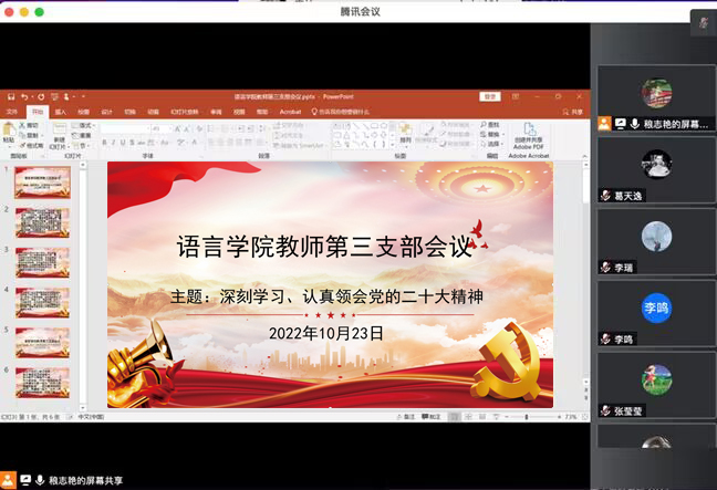 10月23日晚,语言学院教师第三党支部召开了“深刻学习、认真领会党的二十大精神”会议,会议由党支部书记稂志艳主持,支部成员积极参加,并踊跃发言。