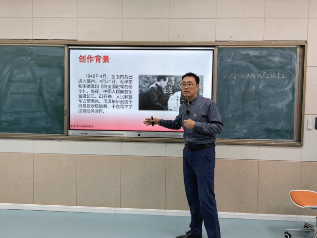 10月26日下午,语言学院中文系全体教师围绕李鸣老师的决赛参赛作品通过视频会议的形式进行观摩研讨,开展了专题教研活动,语言学院执行院长王东和党总支书记丁祖保参加了此次教研活动。李鸣老师在博雅楼智慧教室1609进行教学能力大赛作品现场展示。李鸣老师选取了毛泽东主席的红色经典诗词《七律•人民解放军占领南京》为讲解篇目,结合党史、课程思政,潜心设计,有诵读,有讲解,教学技巧娴熟,课堂控制能力强,教学过程深入浅出,对诗词的整体把握精当,对中华传统文化和党史元素的教学融合弘扬了时代精神,融思想教育于教学之中。展示结束后,中文系赵惠岩教授、孟宪华副教授、国丽芸副教授等教师根据大赛参赛作品要求及评价标准分别从教师仪表、板书设计、课件制作、课程思政等方面提出了改进建议。中文系主任康盛楠教授指出参赛的积极意义,对李鸣老师的参赛作品给予高度肯定,也提出了中肯建议,并预祝李鸣老师在决赛中取得佳绩!
