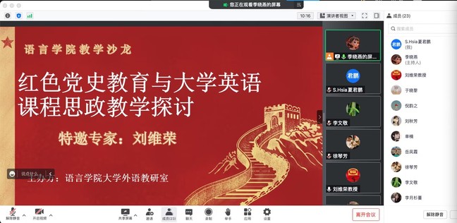 10月26日下午,语言学院特邀江苏省档案馆研究馆员、四级调研员刘维荣老师为学院大学外语公共教研室全体教师进行了一场红色党史教育,并与老师们进行了课程思政教学研讨。该活动由大学外语公共教研室主任季晓燕主持,学院行政人员及教研室全体教师参加了此次沙龙活动。