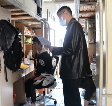 为确保管理学院疫情防控期间线上教学的顺利进行,管理学院党总支书记邱淑永和辅导员陆剑老师对各宿舍进行走访。邱淑永书记呼吁同学们保持积极向上的良好心态,要常通风、勤洗手、不聚集、戴口罩,做好各项防护措施。