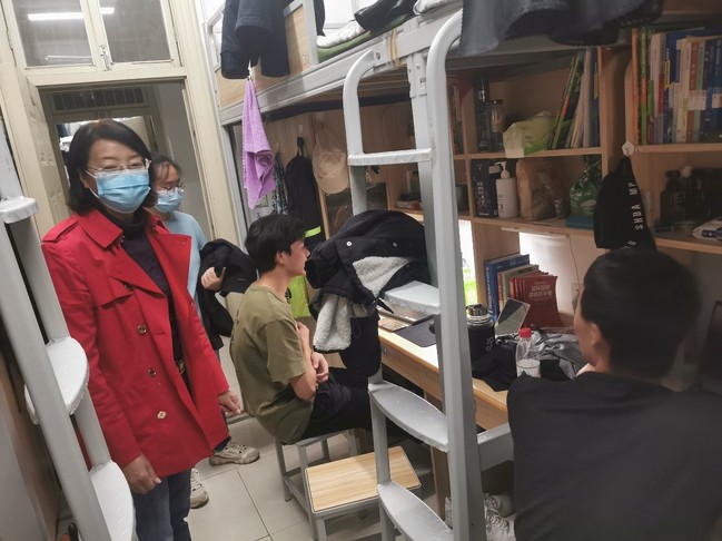 金梅副院长来到学生宿舍,关心询问学生疫情防控期间的线上学习、体育锻炼、饮食等情况,叮嘱学生特殊时期也要上好网课,加强时间管理,养成良好的学习习惯和生活作息。同学们纷纷表示会合理规划好在校期间的学习与生活,活动时会做好自我防护,加强体育锻炼,保持良好心态,严格遵守学校各项管理规定。