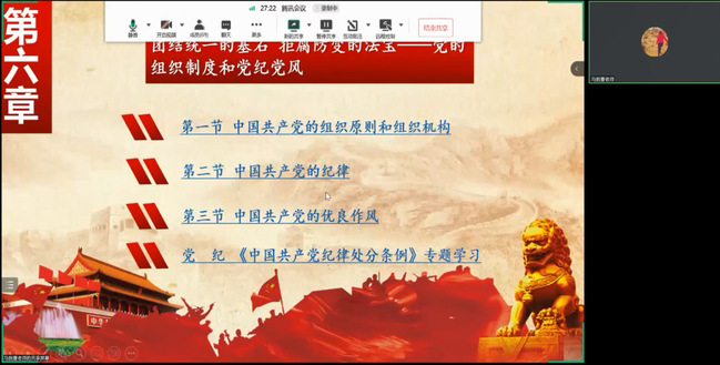 11月2日晚,语言学院线上进行了2022年下半年分党校第一次授课。本次党课由马克思主义学院曹宗敏老师主讲,主题为《团结统一的基石 拒腐防变的法宝——党的组织制度和党纪党风》。本期入党积极分子共计67名,悉数参与了课程学习。