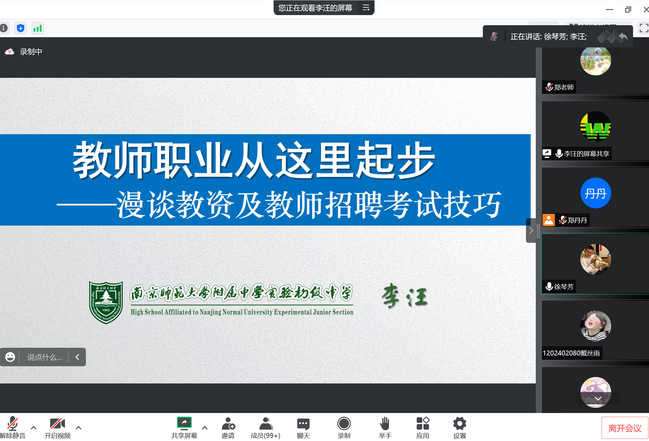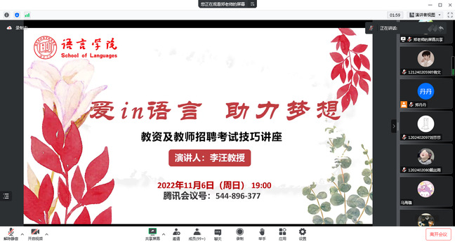 11月6日晚,语言学院邀请南京师范大学附属中学实验初中副校长李汪教授线上开展教资及教师招聘考试技巧讲座。本次讲座由团总支书记、学工办主任郑丹丹主持,副院长徐琴芳、学院党总支副书记张冬冬和语言学院大三、大四学生参加。