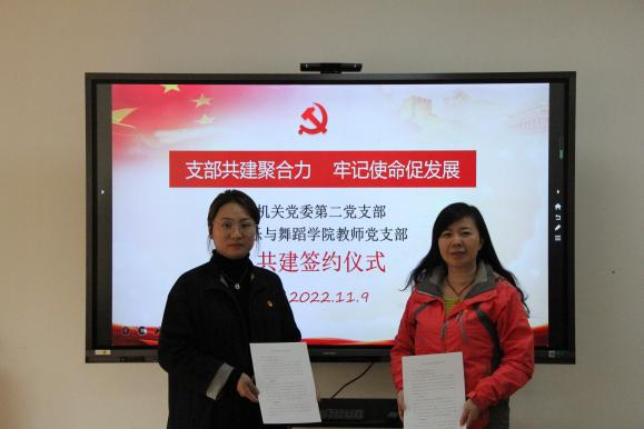 为深入学习贯彻党的二十大精神,进一步加强党的建设,强基固本、争先创优,11月9日,音乐与舞蹈学院教师党支部与机关党委第二党支部顺利举行了“支部共建聚合力 牢记使命促发展”共建签约仪式暨第一次集体理论学习。会议由音舞学院党总支书记蒋科星同志主持,两个共建支部的支委参与交流。