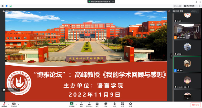 11月9日下午,南京师范大学文学院院长、中国古代文学专业教授、博士生导师高峰应邀做客南京特殊教育师范学院语言学院“博雅论坛”,在博雅楼3501为全院师生做了一场题为《我的学术回顾与感想》的精彩报告,为我校40周年校庆增添了学术华彩。论坛以线上线下、栖霞校区与江宁校区相结合的方式进行,取得了良好效果。
