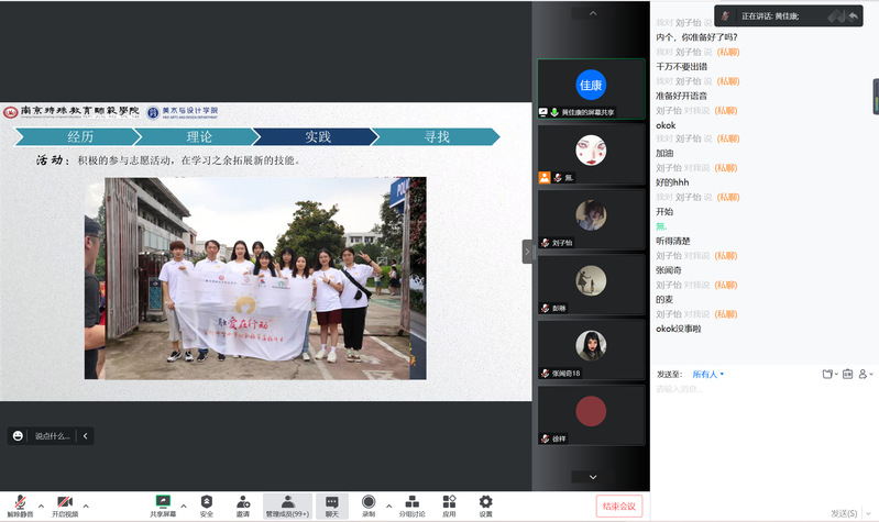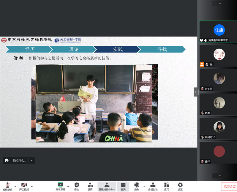 美术2001班黄佳康同学从经历、理论、实践、寻找四个方面进行分享。他表示,进入大学后,自己通过参加学生工作、志愿活动得到锻炼,在学习之余不断拓展自己的新技能,建议在场同学能够合理有效地规划自己的大学生活。美术2002班秦焕杰同学讲述了自己在追求目标的道路上,虽受挫折但是永不放弃的种种事例。只有积极面对失败,努力奋斗,才能成为更好的自己。美术2003班徐千惠与美术2004班高许诺两位同学表示大学就是要“动起来”,通过课堂内外的学习和实践,不断积累经验,从而提升自我。美术2006班许睿佳同学则分享了自己对专业的认知与理解。