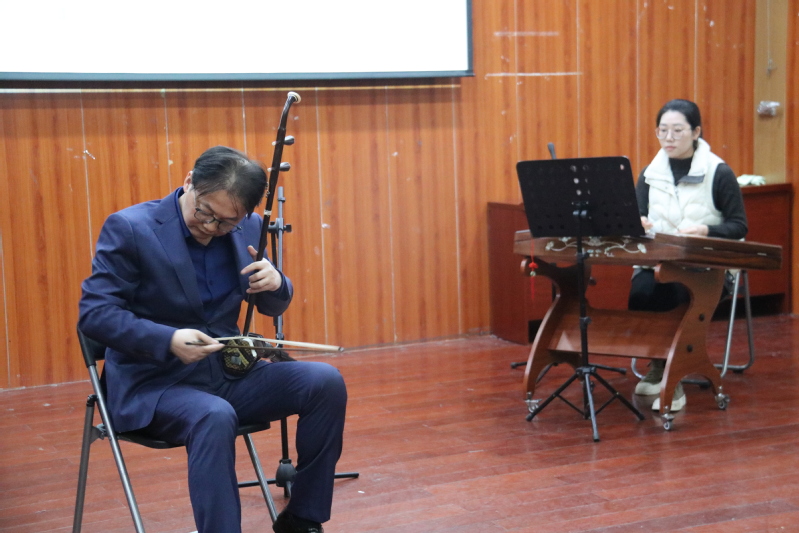 召唤教授还亲自为大家演奏了几首二胡名曲,令在场师生如痴如醉。开场的《苏南小曲》充分体现了中国南方文化所特有的小巧玲珑。他将音域的变化和转调巧妙地组合在一起,使整个演奏始终处于精巧伶俐的表演气氛。《江南春色》把人们带到了优美如画的江南水乡,静谧而令人陶醉。全曲的主题音乐、旋律秀丽柔美,充满了春天的气息,表现了人们内心的喜悦。而《二泉映月》则表现出二胡无限的温柔与凄苦。召唤教授的琴声似水,如同从斑驳的树影中涌出,前尘、往事洒落一地。接着,他又为大家带来了《姑苏春晓》,乐曲描绘了姑苏城早春时分的自然景象,欢快悠扬,甜美抒情,使人仿佛置身于幽曲明净、精巧秀丽的姑苏园林之中。曲目《如来藏》通过音符的跳跃、旋律的流动、节奏的变化与强弱的起伏,表现了其时代性、主旋律以及对人生的探索。