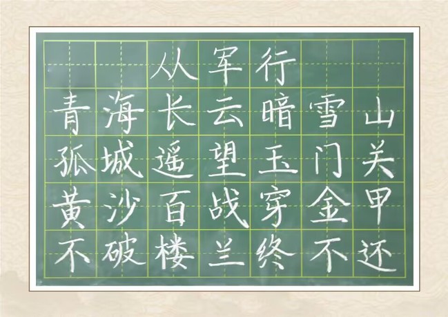 本次活动于10月中旬开始,作品类型分为钢笔字、粉笔字、毛笔字和绘画。同学们的书法作品题材丰富,绘画作品色彩缤纷,主题大多与弘扬历史文化、歌颂革命精神相关,蕴含了同学们对老一辈革命家勇于实践、勇于探索、勇于思考、奋发进取的开拓精神的崇高敬意。书法作品中,或是笔势雄奇的钢笔字,或是行云流水的粉笔字,或是骨力道健的毛笔字。粉笔字作品《从军行》笔走龙蛇,一笔一划铿锵有力,字里行间流露出“不破楼兰终不还”的豪情万丈。绘画作品大多是中国水墨画,那一幅幅作品水墨丹青、栩栩如生,充分展现了同学们优异的“三字一画”技能水平。