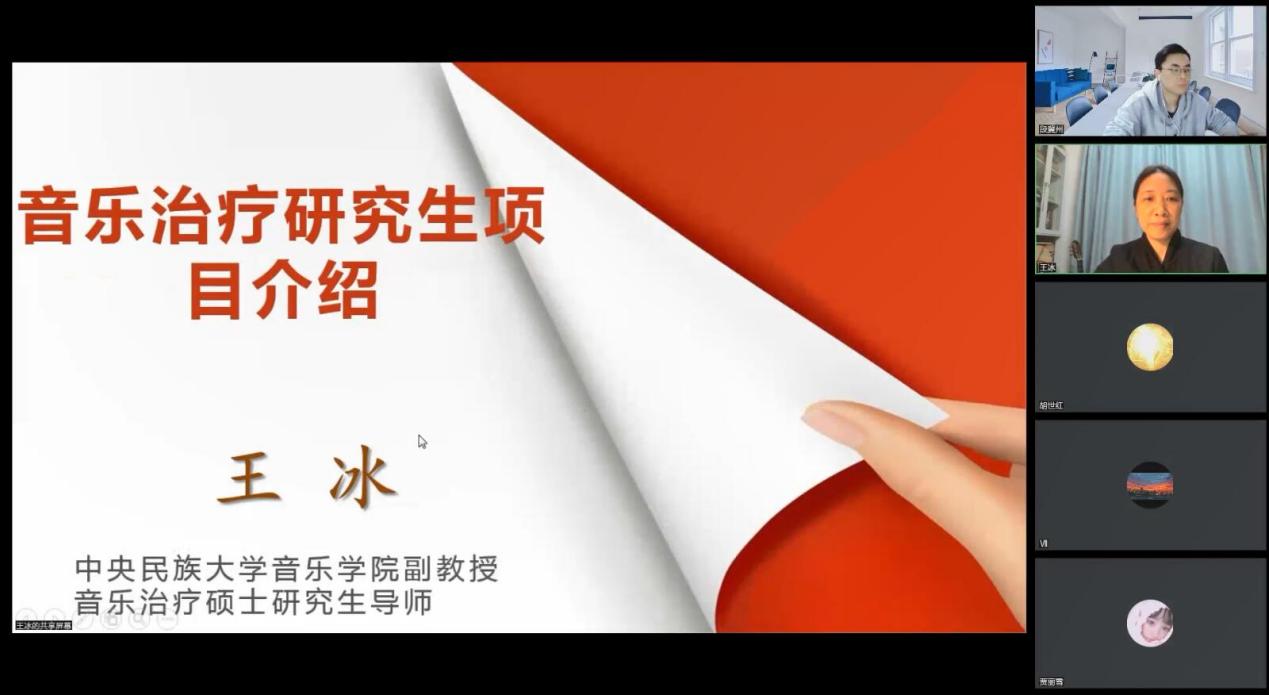 2022年11月17日晚,我校音乐与舞蹈学院音乐治疗系特邀中央民族大学硕士生导师、美国天普大学音乐治疗博士候选人王冰老师,通过线上会议,为学院音乐治疗、音乐学等相关专业学生开展关于音乐治疗考研项目介绍的专题讲座。讲座由音乐治疗系老师胡世红与段冀州主持。