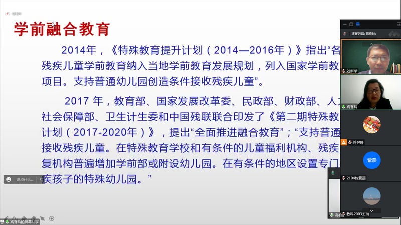 高春玲老师用宣传片《我们都一样》作为学前融合教育讲解的导入,以昆明学院附属幼儿园学前融合教育实践的三个阶段为大家展开详细讲解,包括开始独立成班,设立昆明学院附属经开幼儿园和构建“三个一体”学前融合教育体系,实现了从班级到学校到儿童发展中心的重大跨越。同时,高春玲老师也讲述了学前融合教育的挑战,例如如何实现特殊需要幼儿和普通幼儿平等发展。最后她还为同学们展示了学前融合教育的实践成果,包括形成昆明学院学前融合教育特色品牌等,邀请同学们在学前融合教育的路上一起携手共进。