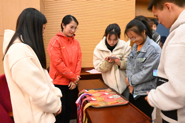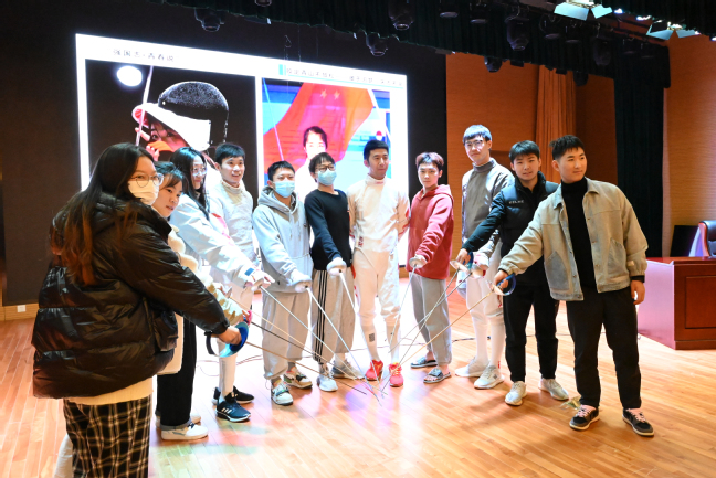 在讲座接近尾声时,荣静还邀请在残疾人体育训练基地集训的击剑教练员和运动队员们为同学们展示不同种类的击剑,并教授大家基础的击剑动作。荣静还给大家展示了她所获得的部分奥运奖牌,让同学们近距离接触到了每一位体育人梦寐以求的奥运奖牌。