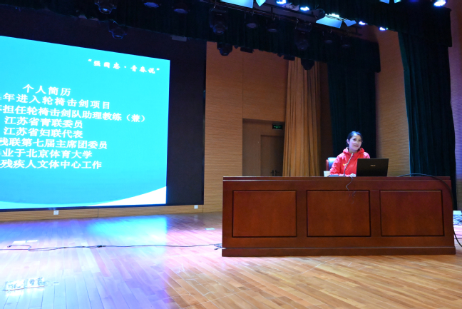 11月16日下午,残奥会冠军荣静在浦口校区为体育学院学生做了题为《强国志青春说》专题报告。学院直属党支部副书记谢军、体育2001班班主任伊晓及全体大二、大三学生现场聆听。