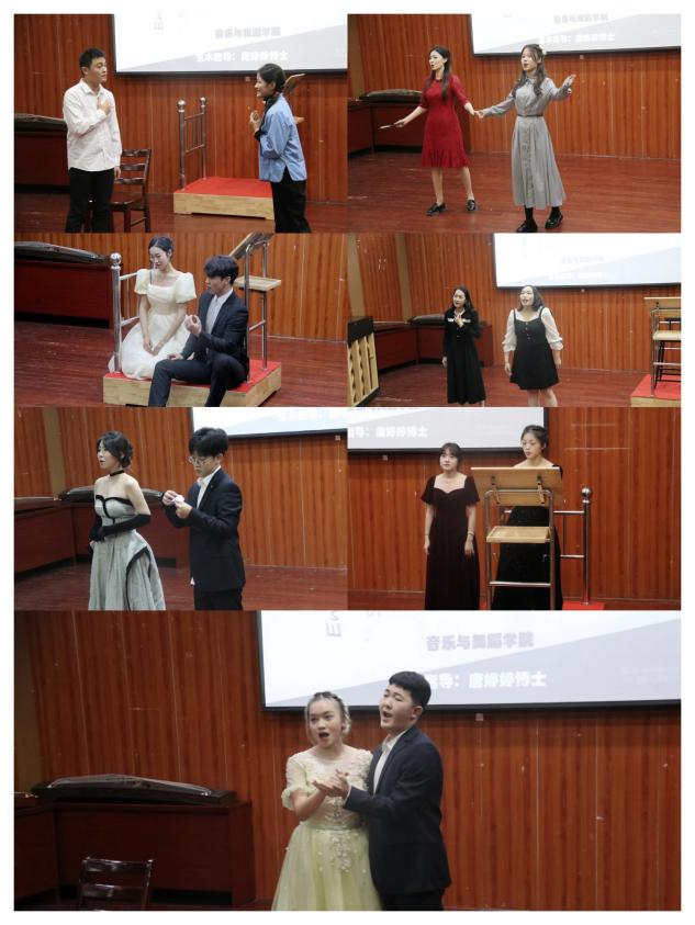 《重唱与表演唱》是声乐表演体系中的重要环节,是一门把歌唱与表演紧密结合,注重培养学生重唱技巧和舞台综合表演艺术的实践课程。本课程由音乐与舞蹈学院唐婷婷博士负责教学及排练指导。唐婷婷老师耐心负责,充分结合人才培养方案和专业教学大纲,每周除了完成常规课程教学外,还定期安排课外2小时的舞台排练。在课程中教学环节中科学调整各声部的声音状态和歌唱技巧的同时,更加注重对作品的艺术处理,如对人物形象塑造、角色分析、表情和肢体语言的配合、舞台走位等,深受同学们的喜爱。