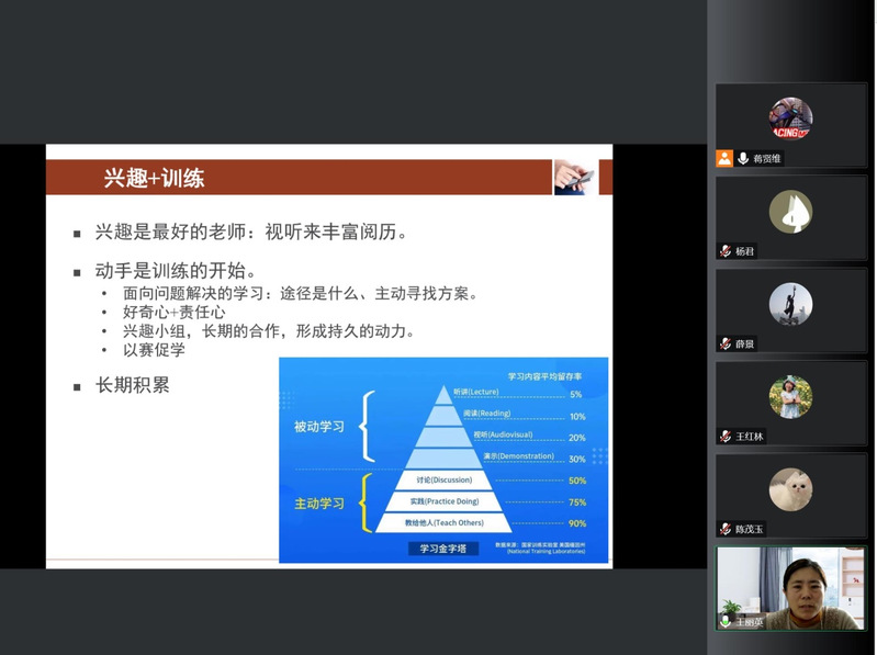 王丽英教授指出,提升学生编程水平可以结合兴趣+训练的方式,通过成果激发,任务驱动,建立同伴团队,长期积累,教师要合理安排讲练比例,选择合适的教材和优秀的参考书,建设好微课、慕课,培养信息时代学习者的能力。王丽英教授还结合教育学、心理学强调发挥学生内部动机和效能,特别提出了基于认知策略、元认知策略和情感策略的思想方法,指出各种语言的学习是有直接联系的,教师要帮助学生实现两者之间的切换和补充。