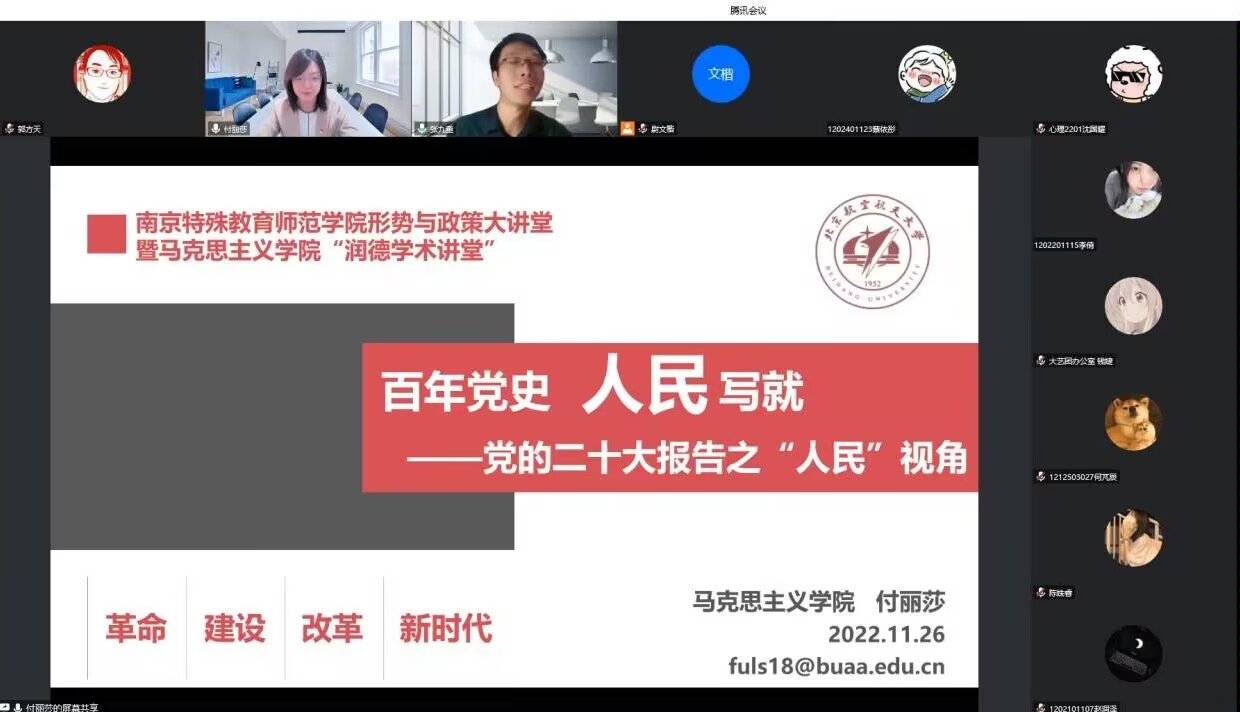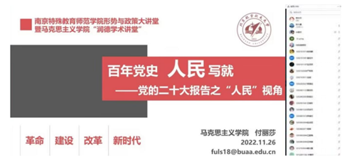 为帮助我校青年学子更好地学懂、学通、学透党的二十大精神,11月26日上午9点,由马克思主义学院和团委联合主办的我校“形势与政策大讲堂”(第六讲)暨马克思主义学院“润德学术讲堂”(第二期)邀请央视《百家讲坛》主讲人、北京航空航天大学马克思主义学院副教授付丽莎老师在线上开讲,马克思主义学院副院长(主持工作)张九童主持讲座,马克思主义学院及校团学组织教师、学校青年马克思主义菁英班等200余名师生听讲。