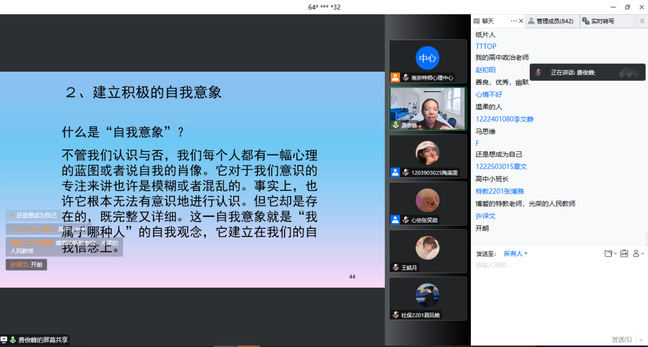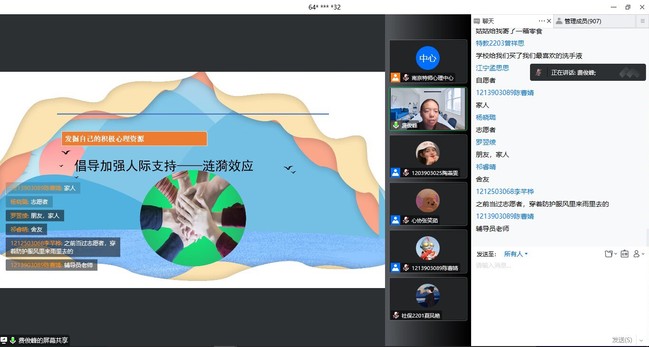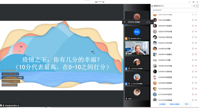 接着,费俊峰老师从问题“疫情之下,你有几分幸福?”“疫情客观上对你的生活带来了什么不那么糟糕的部分”提出了第二个重点——幸福。费俊峰老师为大家讲解幸福的概念和划分,指出幸福也会进行传染,倡导大家创造幸福,分享幸福。其中费俊峰老师以赵同学的情感心理问题为例,鼓励并开导,同学们也对他进行安慰和支持,会议充满温馨与和谐的氛围。