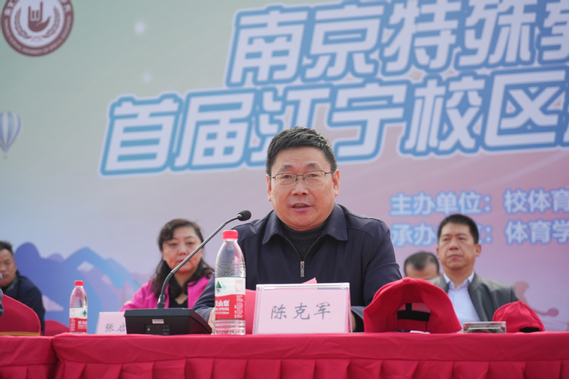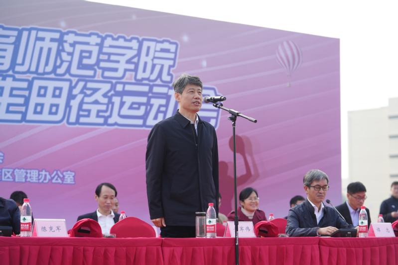 升旗仪式后,陈克军副校长致辞。他指出,学校体育工作是支撑群众体育、竞技体育和体育产业发展的基石,我们要持续深化体教融合,通过“教会、勤练、常赛”,进一步提升青年学生体质健康水平,壮大竞技体育后备人才力量,助力青年学生成为体育强国建设的奋进者、开拓者和奉献者。他回顾了今年我校体育工作取得的成绩并指出,此次运动会是对我校体育工作的又一次大检阅,是师生欢聚、增进交流、公平竞争、团结拼搏的大平台。在即将到来的40周年校庆和迎接本科教学工作合格评估之际,他希望全校上下用行动诠释“更高、更快、更强、更团结”的体育精神,踔厉奋发、砥砺前行,携手共创南京特师美好未来!