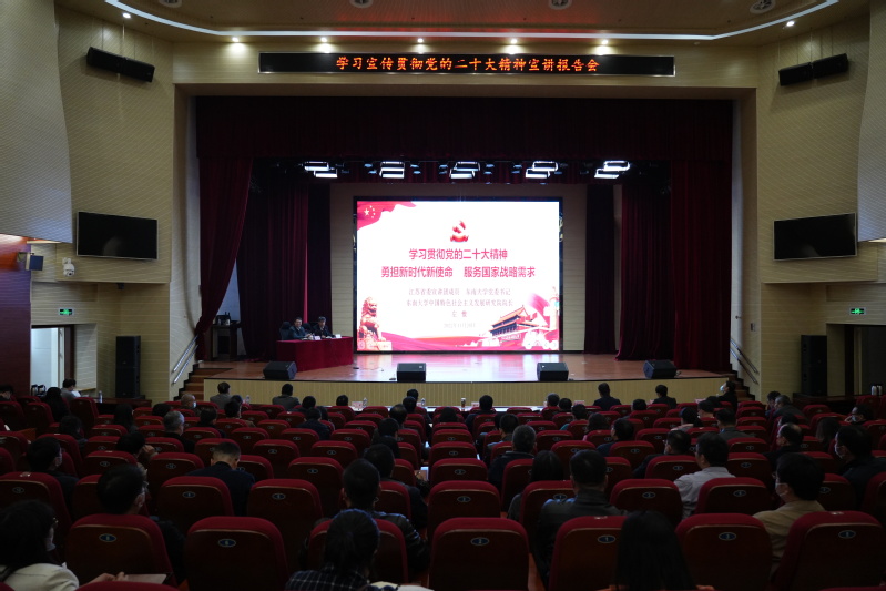 11月28日下午,我校举办学习宣传贯彻党的二十大精神宣讲报告会。党的二十大代表、江苏省委宣讲团成员、东南大学党委书记左惟教授应邀来校宣讲党的二十大精神。报告会由我校党委书记黄军伟主持,校领导、党委委员、纪委委员、中层干部、人大代表、政协委员、教授代表参加会议。