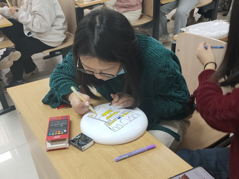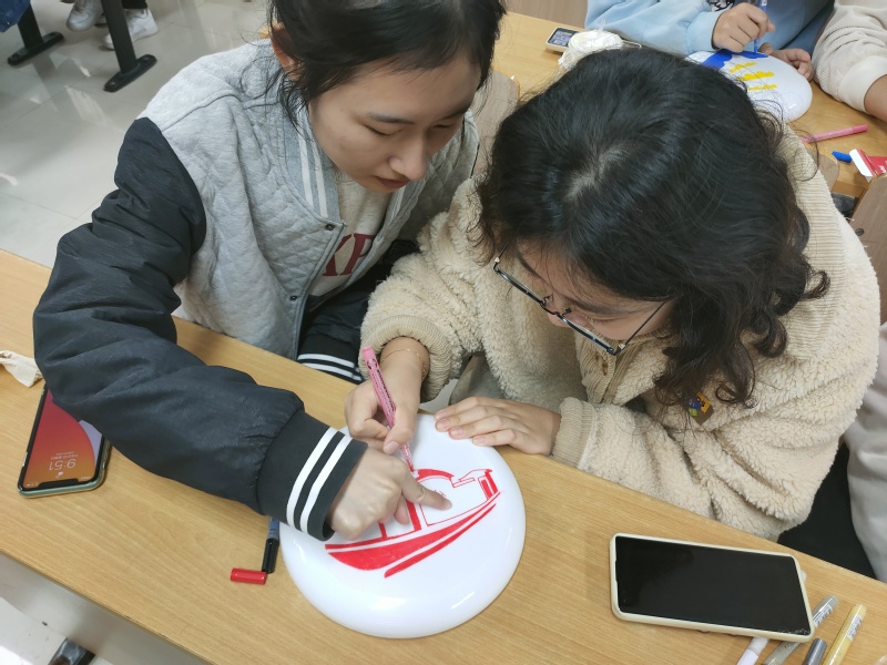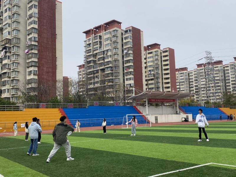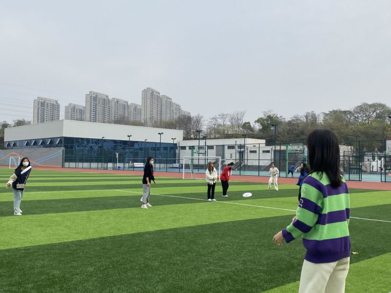 接着,同学们带着绘制好的飞盘来到操场,体验飞盘运动的乐趣。20级学生党员杨露瑶向同学们讲解了飞盘的抛接手势,并带领大家进行了热身。飞盘融合了橄榄球、足球、篮球的玩法,强度不大、简单易上手,同学们很快就掌握了要领,快乐地玩耍起来。最后,在20级学生党员张心濛的组织下,同学们分成两队进行比拼。大家在对抗中挥洒汗水,奋勇争先,享受运动的乐趣。