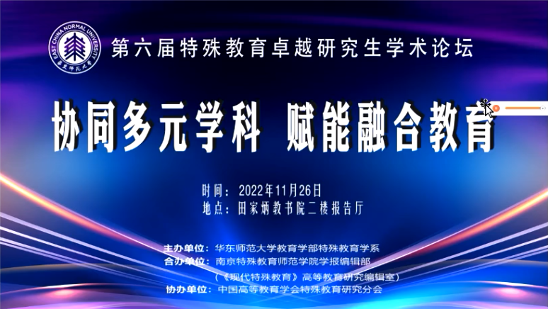 11月26日,由我校学报编辑部和华东师范大学特殊教育学系联合举办的“协同多元学科,赋能融合教育”——第六届卓越研究生论坛在华东师范大学举行。本届论坛采用线上线下相结合的方式进行,吸引了全国众多高校的特殊教育学子,线上参会师生近300人。我校特殊教育学院卓越班的学生也通过线上方式全程参与学习。
