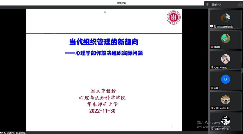 2022年11月30日晚,华东师范大学心理与认知科学学院教授、博士生导师刘永芳教授为教育科学学院应用心理系的师生开展了以“当代组织管理的新趋向——心理学如何组织解决组织实际问题”为题的学术讲座。本次讲座由教育科学学院院长刘新学教授主持,心理系主任黄晶晶老师、部分教师和全体学生聆听了本次讲座。