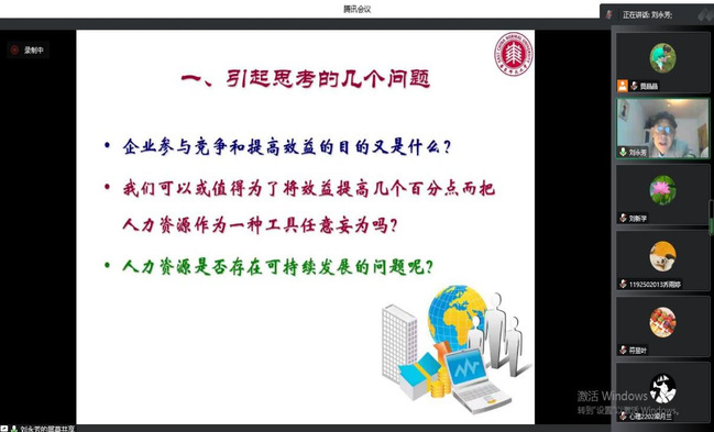 刘教授以“企业参与竞争和提高效益的目的又是什么?我们可以或值得为了将效益提高几个百分点而把人力资源作为一种工具任意妄为吗?人力资源是否存在可持续发展的问题呢?”三个问题引入主题,引出现代组织管理理念层次的变化:从手段到目的的转变,从HRM到HRD的转变。接下来刘教授依次为同学们分享了现代企业管理的变化、在企业的管理中心理学如何突出自身优势以及心理学理论在实际问题中的应用等内容。刘教授指出,企业过去的制度化管理主要注重薪酬、绩效考核等的物质福利,然而如今新时代的企业管理应该在物质的基础上增加员工的精神福利,注重员工的心理健康,建构一个心理健康的员工队伍。在谈到如何解决实际问题时,刘教授为师生们分享了精彩的研究实例,介绍了心理管理学的研究新趋向。