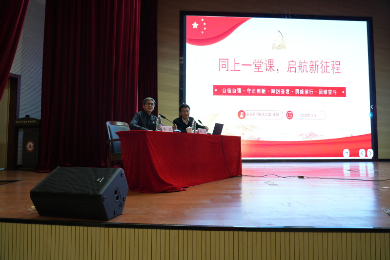 开班仪式结束后,举行了党的二十大精神宣讲报告会。党的十九大、二十大代表,省委宣讲团成员、南京航空航天大学马克思主义学院党委书记徐川教授宣讲。会议由校党委副书记谭忠主持,全体中层正职干部、学工处、团委全体人员,各二级学院党总支(直属党支部)副书记、各二级团总支负责人、全体辅导员、学生党员代表、学生组织代表聆听宣讲报告。