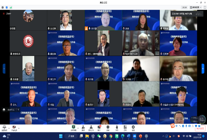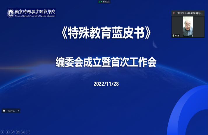 2022年11月28日,《特殊教育蓝皮书》编委会成立暨首次工作会在线上召开。来自北京师范大学、华东师范大学、华中师范大学、陕西师范大学、西南大学、重庆师范大学、华南师范大学、西北师范大学、新疆师范大学、山东师范大学、浙江师范大学、长春大学、天津理工大学、南京邮电大学、浙江工业大学、北京联合大学、山东滨州医学院、南京特殊教育师范学院、台湾师范大学、香港教育大学、中国教育科学研究院等高校和研究机构的30余名特殊教育领域专家学者出席会议。