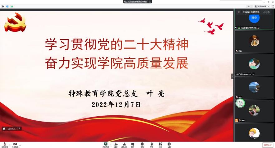 12月7日下午,特殊教育学院开展书记上党课活动,由学院党总支书记叶亮开展题为《学习贯彻党的二十大精神 奋力实现学院高质量发展》专题党课,特殊教育学院全体教职工和学生党员参加活动。