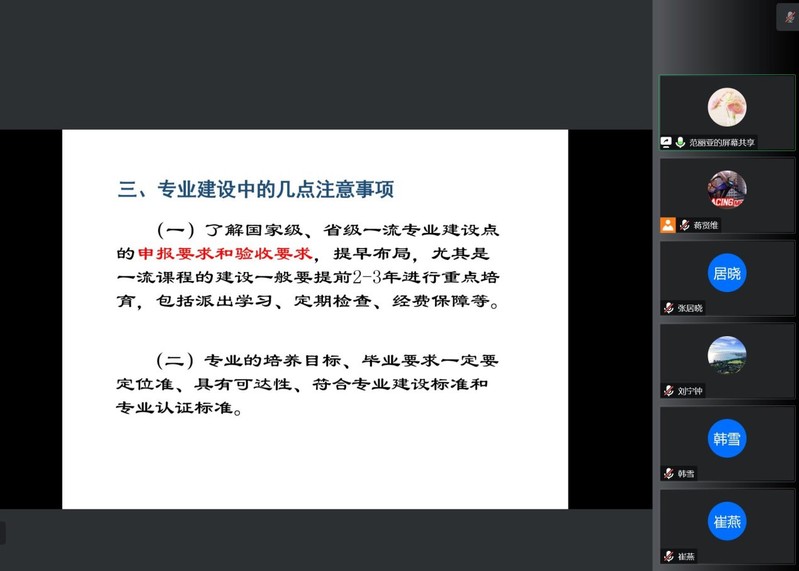 专家们还就专业建设过程的注意事项给出了详细指导。他们指出,要清楚了解省级一流专业建设点的申报要求和验收要求,提早布局,尤其是一流课程的建设一般要提前2-3年进行重点培育;课程目标如何达成、达成度如何计算、未达成的原因、如何进行改进等要有明确的计算方法和说明;省部校级文件的收集学习与讲解、专业建设材料的收集与整理、申报书验收报告的撰写等工作都要有专人负责,且有若干个团队协同工作;课程和教材要注意校内辐射和校外推广;建设成果不仅是教师的成果,更要重视学生的成果和获奖;要构建完整的教学质量保障体系和常态化监控机制。
