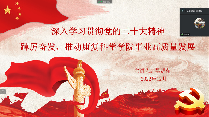 为深入学习贯彻党的二十大精神,12月7日,康复科学学院党总支书记吴洪菊以“深入学习贯彻党的二十大精神,踔厉奋发,推动康复科学学院事业高质量发展”为题,讲授学习贯彻党的二十大精神专题党课,康复科学学院全体教师参加。