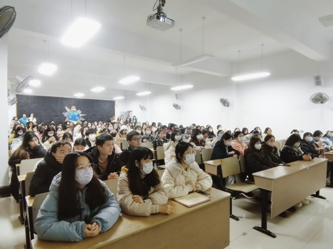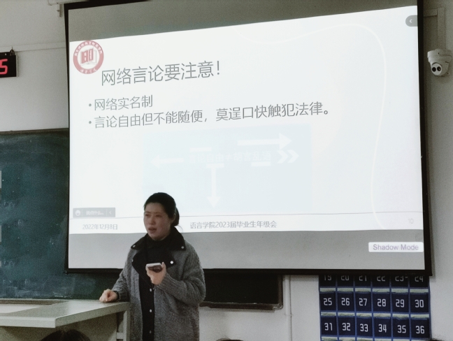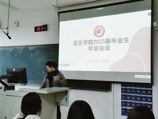 为鼓励考研学生坚持到底,尽早谋划做实2023届毕业生毕业就业工作,语言学院2023届毕业班年级大会于2022年12月8日晚线上线下同步召开。会议由毕业班辅导员郑丹丹主讲,学院党总支副书记张冬冬与在校的180多名学生共同参加线下会议。