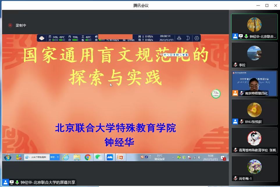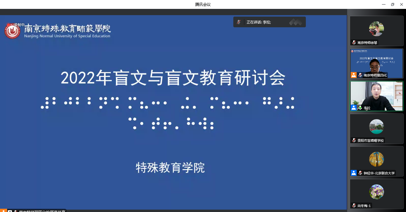 12月11日上午,特殊教育学院主办的“2022年盲文与盲文教育研讨会”在线上召开。来自16个省、直辖市、自治区的30多所高校、特殊教育学校共计300名专家、学者和特校教师汇聚一堂,交流分享盲文与盲文教育研究成果。
