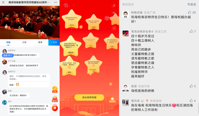 在南京特殊教育师范学院喜迎40年华诞之际,曾经的学子,如今的校友,跨越山海,心手相牵,有些来到南特校园,有些在云端,共贺母校四秩华章,纷纷为母校送上深情祝福。