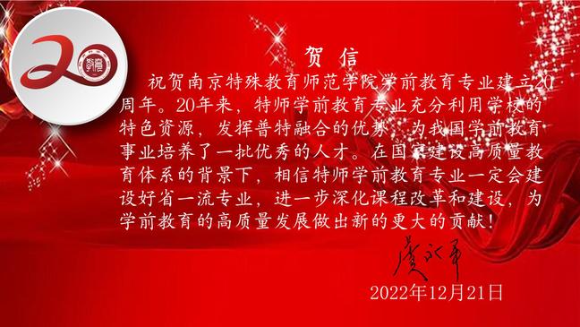 虞永平教授也为学前教育专业办学20周年表示祝贺。他表示20年来,南特学前教育专业充分利用学校的特色资源,发挥普特融合的优势,为我国学前教育事业培养了一批优秀的人才。在国家建设高质量教育体系的背景下,相信南特学前教育专业一定会建设好省一流专业,进一步深化课程改革和建设,为学前教育的高质量发展做出新的更大的贡献!