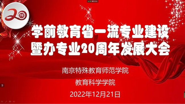教育科学学院院长刘新学主持会议,出席大会的有南京特殊教育师范学院副校长张茂林;中国学前教育研究会理事长,世界学前教育组织OMEP中国委员会委员、中国学前教育研究会课程与教学专业委员会副主任、教育部基础教育学前教育保工作指导专委会委员侯莉敏教授;前中国学前教育研究会理事长、中国学前教育研究会课程与教学专业委员会主任委员,国家重点学科“学前教育学”学科带头人,中国学前教育研究会学术委员会主任虞永平教授。出席大会的还有南京特殊教育师范学院校友代表以及教育科学学院全体教师。大家通过网络平台在线观看大会直播,共襄学院学前教育专业建设20周年大会。