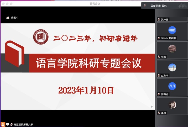 1月10日下午,为深入传达学校科研会议精神,推动学院科研快速发展,语言学院召开以“二〇二三年,科研奋进年”为主题的科研专题会议。会议由学院执行院长王东主持,学院领导班子和全体教师参加会议。