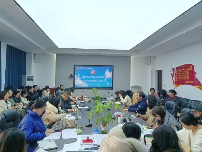 为及时落实学校全面推进改革创新的精神,推动学院新学期各项工作全面发展,2月16日,语言学院分别召开院务扩大会议和全体教职工会议。会议由学院执行院长王东主持,学院领导班子、系教研室主任、各党支部书记、各教研团体负责人和全体教师参加会议。