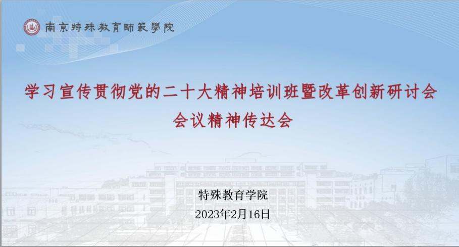 2023年是全面贯彻落实党的二十大精神的开局之年,是推进落实学校第二次党代会精神、全面推进改革创新的起步之年,也是迎接本科教学工作合格评估和实施“十四五”规划承上启下的关键一年。为了使今年的工作开好局、起好步,2月13日至14日,学校在镇江扬中举办了学习宣传贯彻党的二十大精神暨改革创新研讨会。2月16日晚,特殊教育学院召开线上全体教师会议,就会议精神进行传达和集体学习,会议由院长李拉主持,党总支书记叶亮传达。