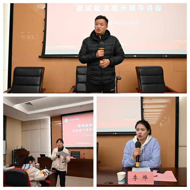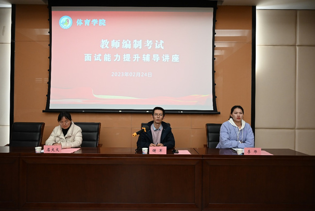 2月24日晚,体育学院举办教师编制考试面试能力提升辅导讲座。讲座分两场进行,第一场由体育学院专任教师李烨和学工办主任屈文文主讲,第二场由学生工作处副处长朱玉飞主讲。讲座由学院直属党支部副书记谢军主持,学院1901班、2001班全体学生参加。